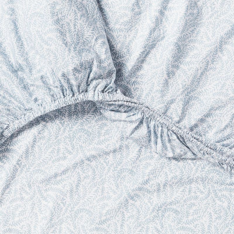 Refresh your bedroom with this 250-Thread-Count Organic Percale Sheet Set from Threshold™. Washed to create the look and feel of vintage sheets, this four-piece bedding set includes one fitted sheet, one flat sheet and two pillowcases. Each piece is made from 100% organic cotton with a durable percale weave for enduring comfort, and they can be tossed in the washing machine for quick and easy cleaning. Plus, the fitted sheet includes easy, bed-making placement labels and a patented technology that ensures a better fit on most mattresses.